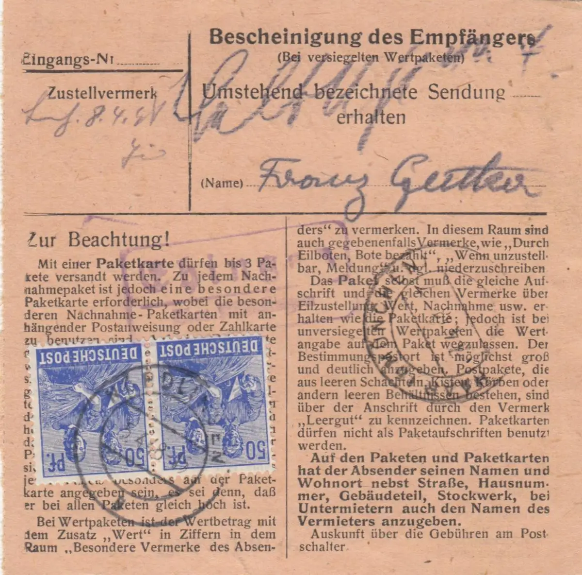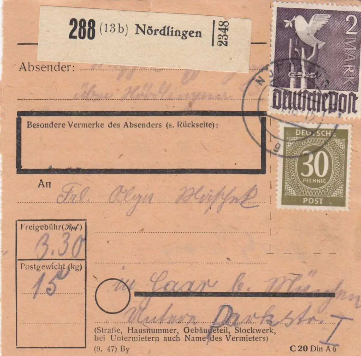 Paketkarte 1948: Nördlingen nach Haar bei München