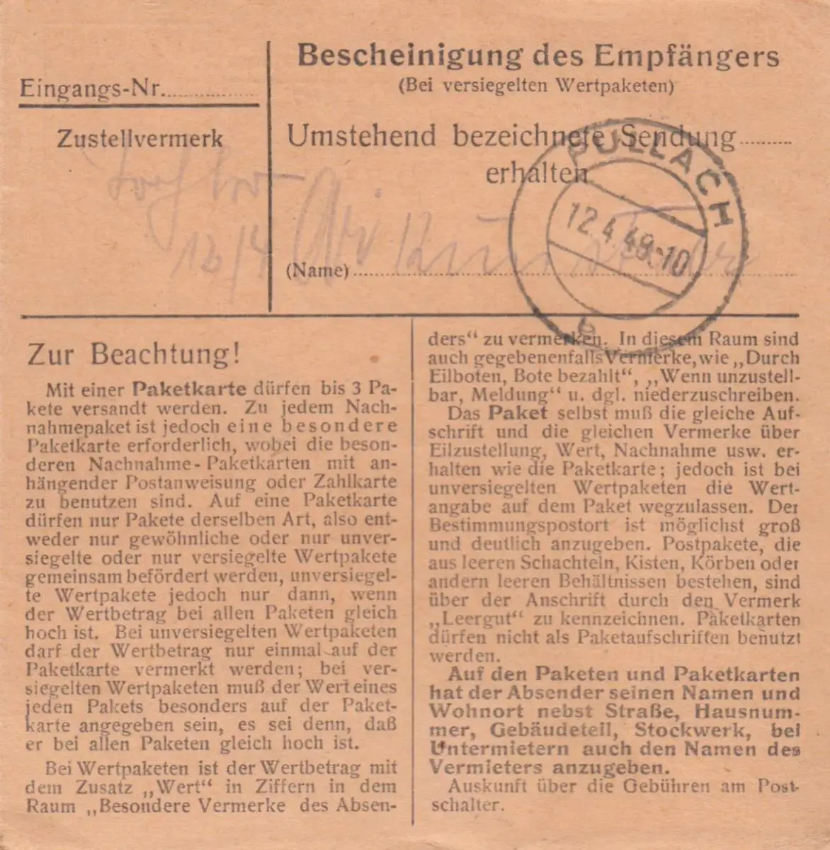 Paketkarte 1948: Obergünzburg nach Pullach, Nachgebühr
