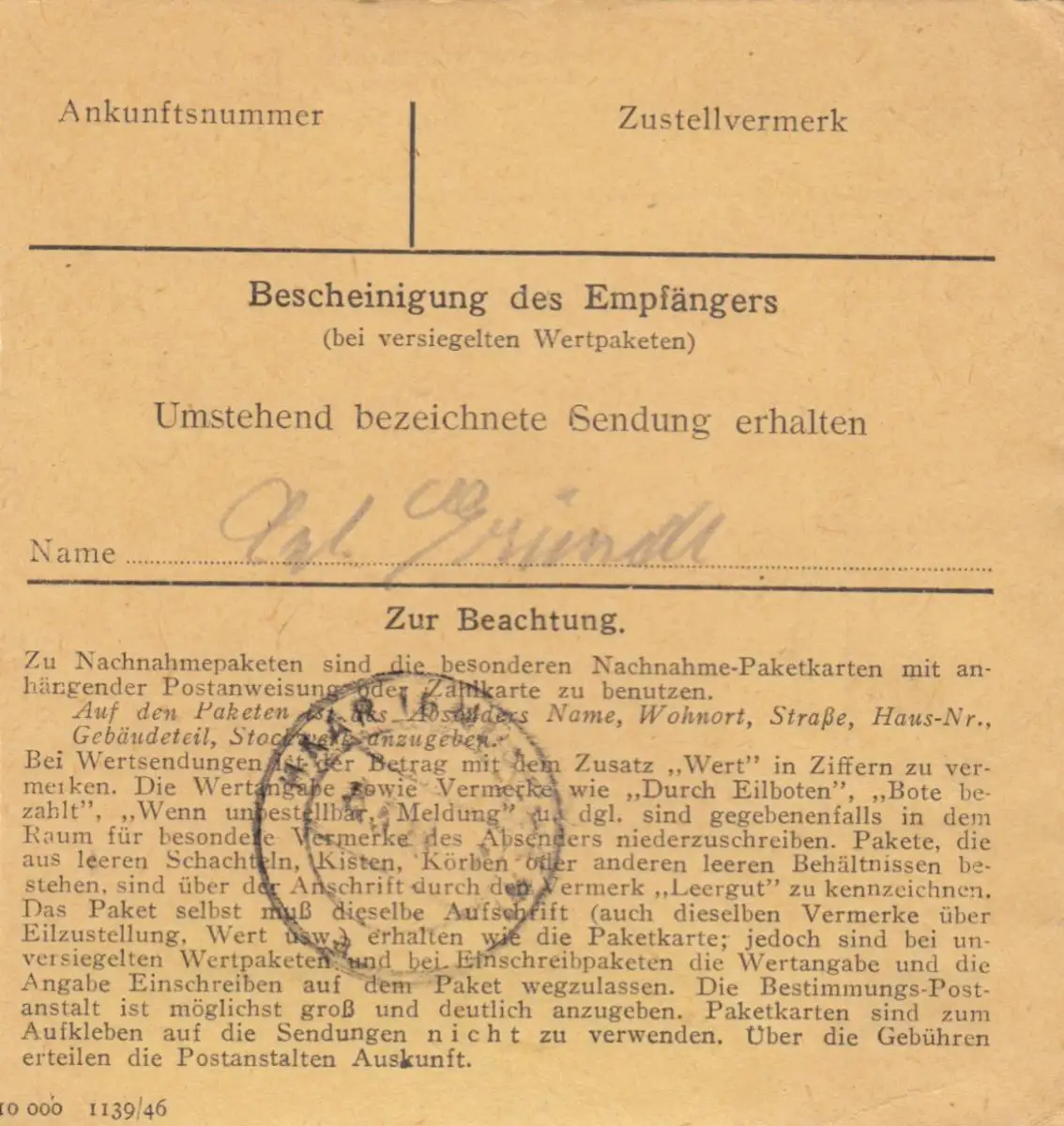 Paketkarte 1948: Redenfelden Raubling nach Eglfing, Selbstbucher