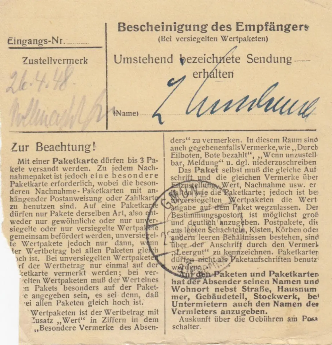 Paketkarte 1948: Regensburg, Werkzeugfabrik nach Moosrain
