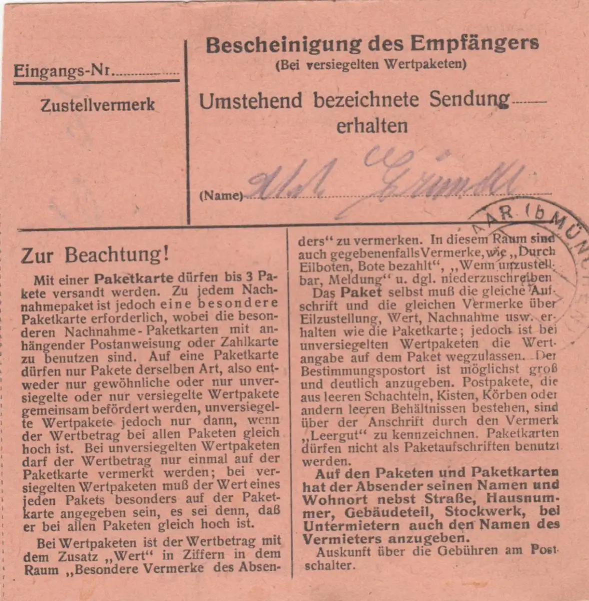 Paketkarte 1948: Roding nach Haar, Betriebsrat Heilanstalt