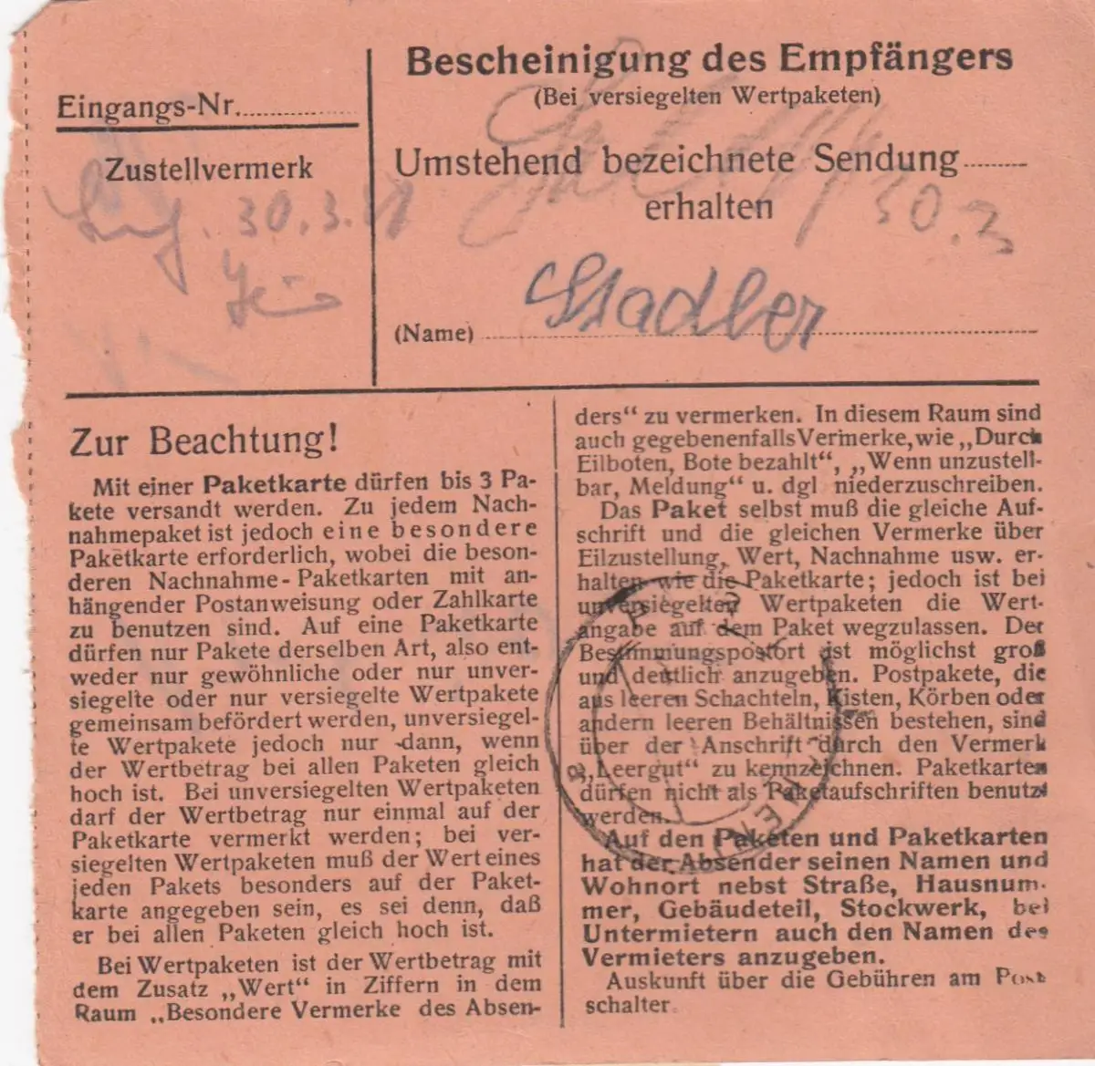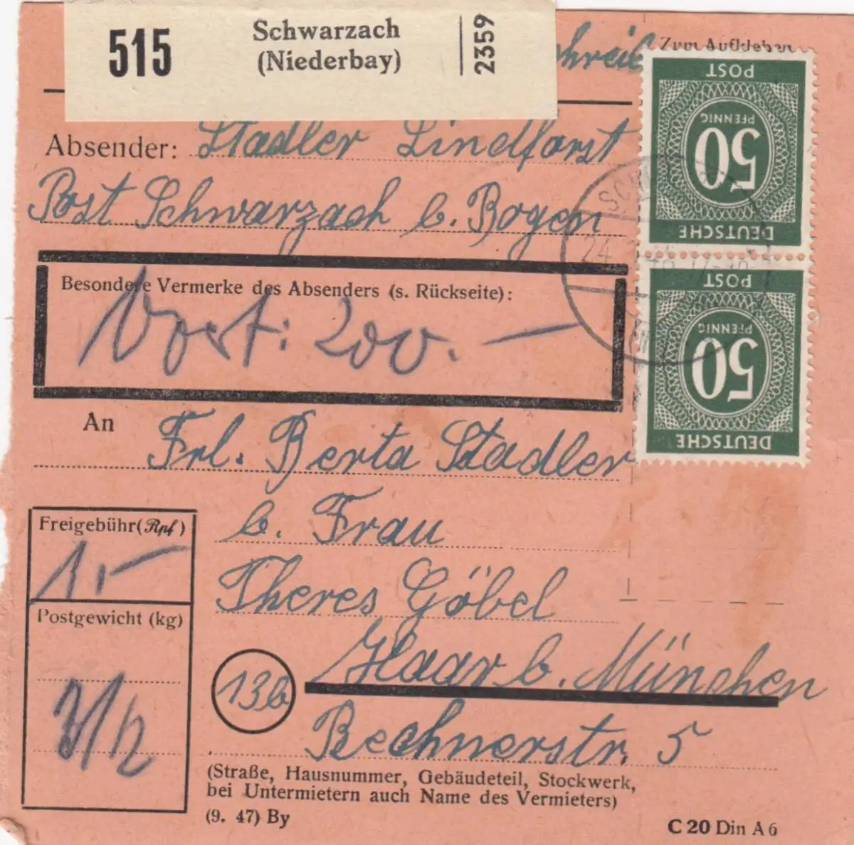 Paketkarte 1948: Schwarzach bei Bogen nach Haar, Wertkarte