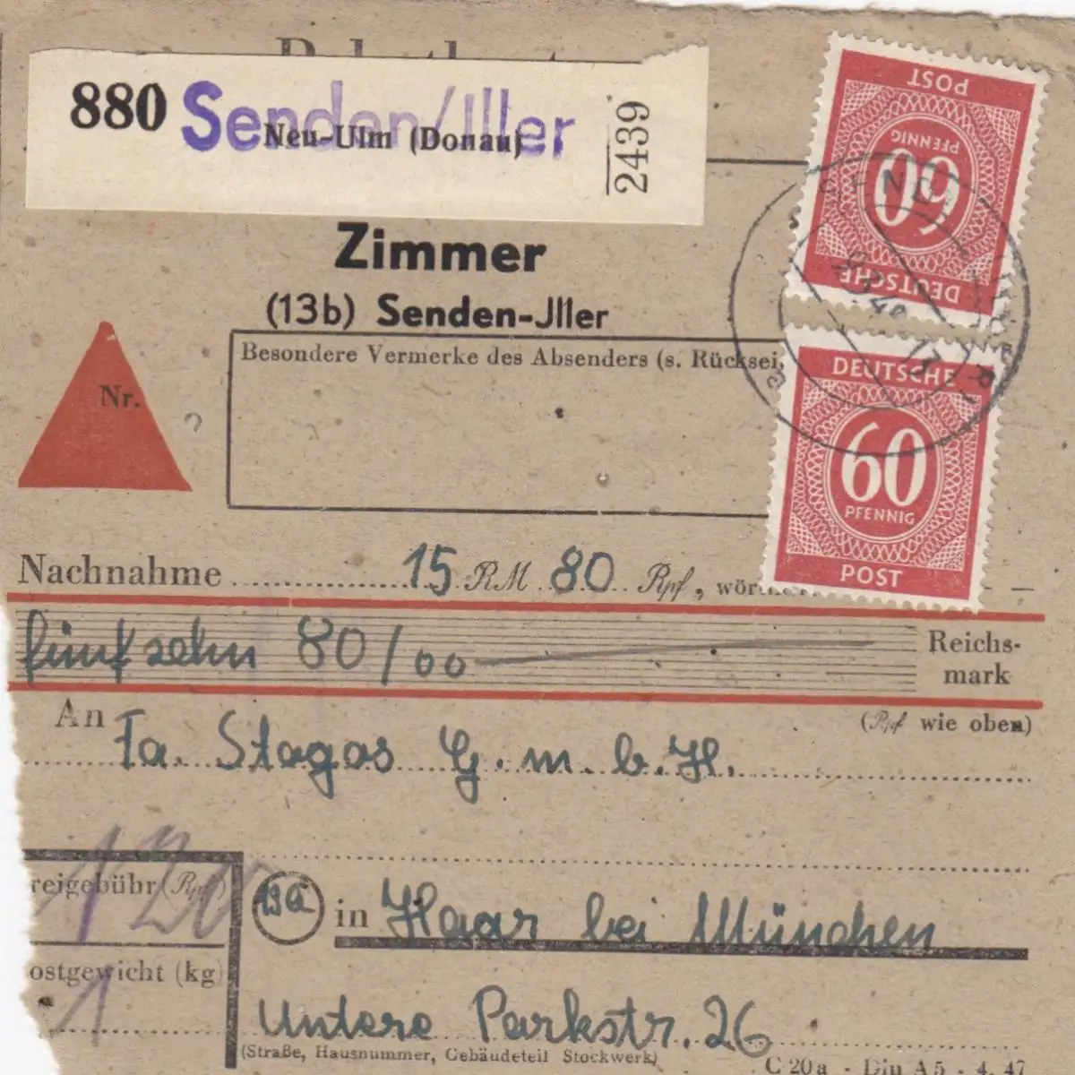 Paketkarte 1948: Senden Iller nach Haar, Nachnahme, Selbstbucher