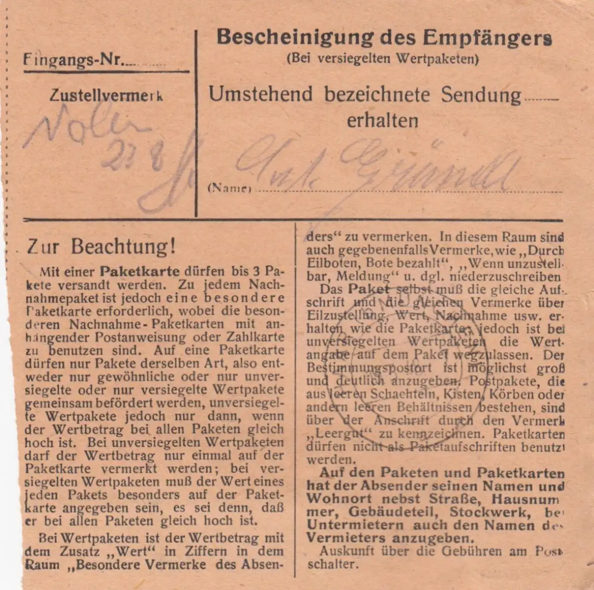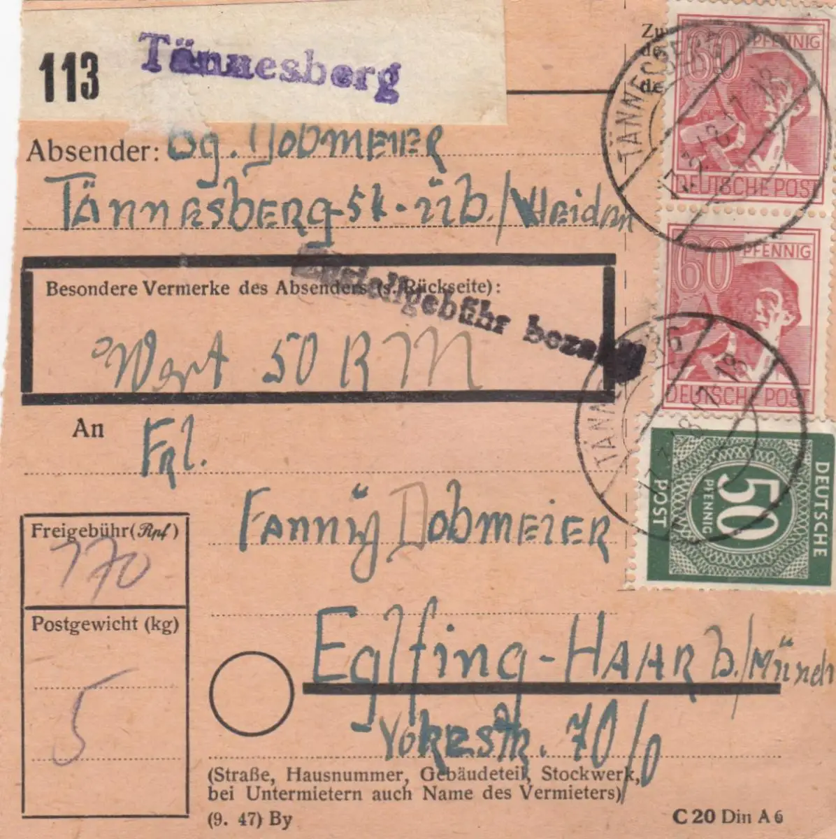 Paketkarte 1948: Tännesberg nach Eglfing Haar, Wertkarte