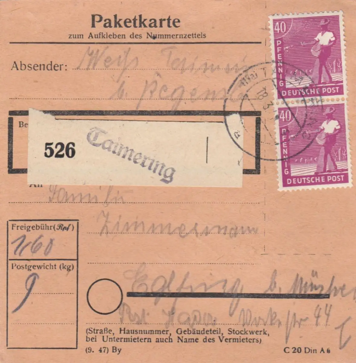 Paketkarte 1948: Taimering nach Eglfing b. München