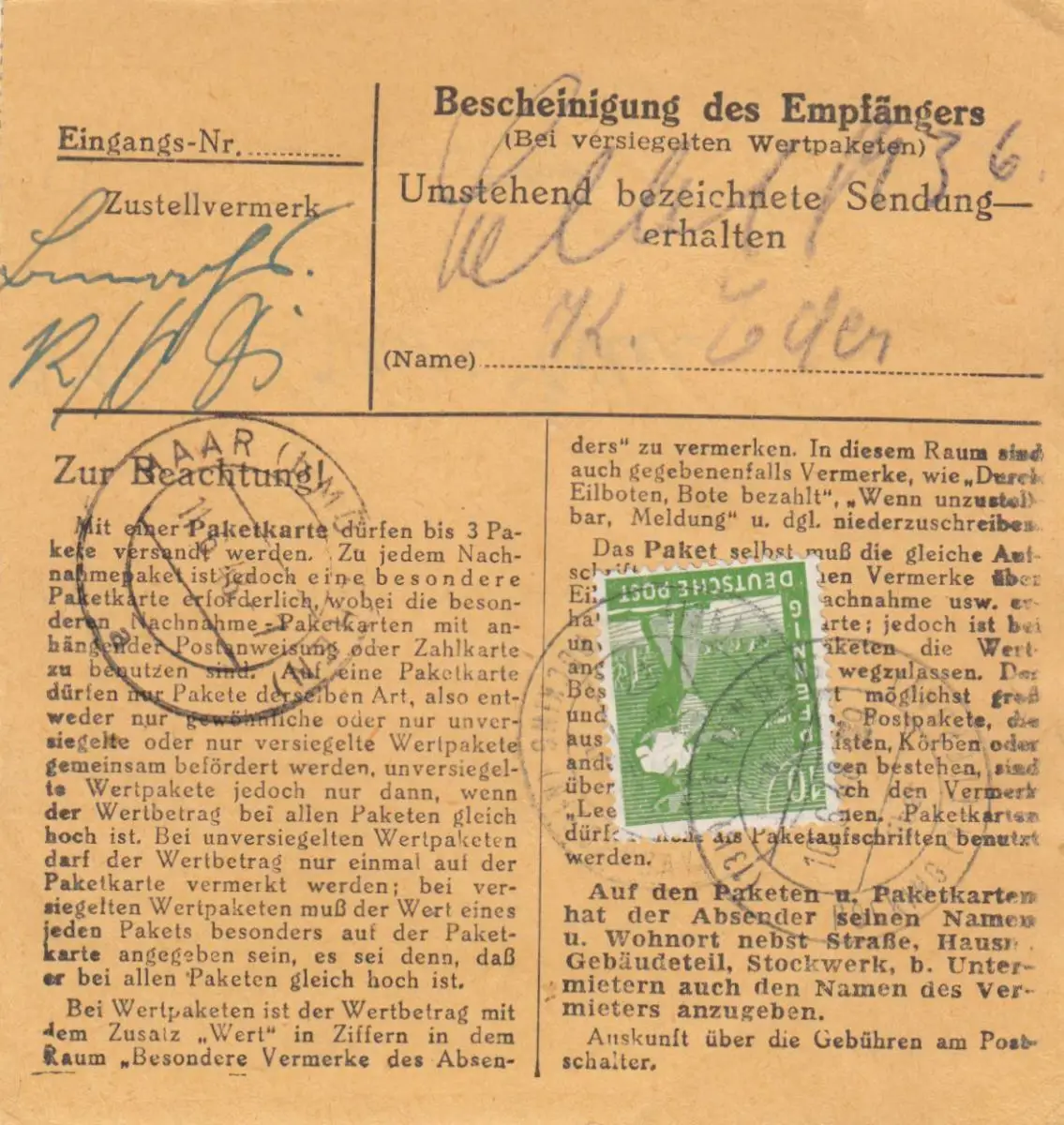 Paketkarte 1948: Tiefendobl Tettenweis nach Ottendichl