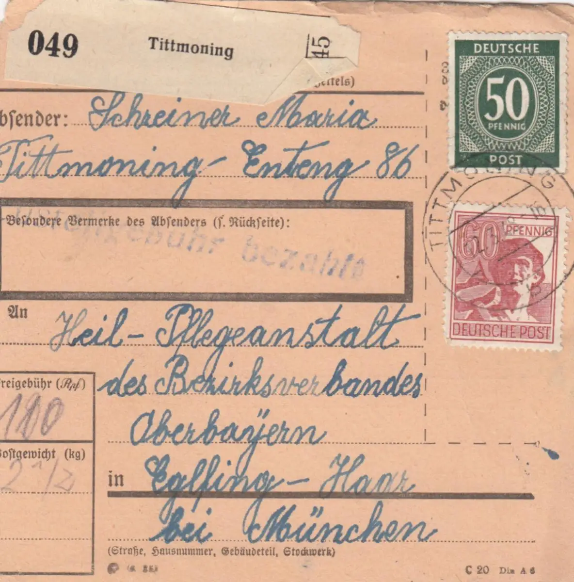 Paketkarte 1948: Tittmoning nach Eglfing, Heilanstalt