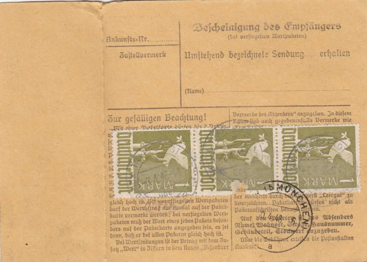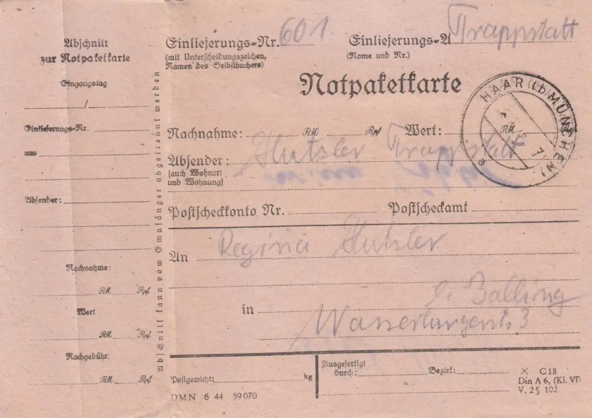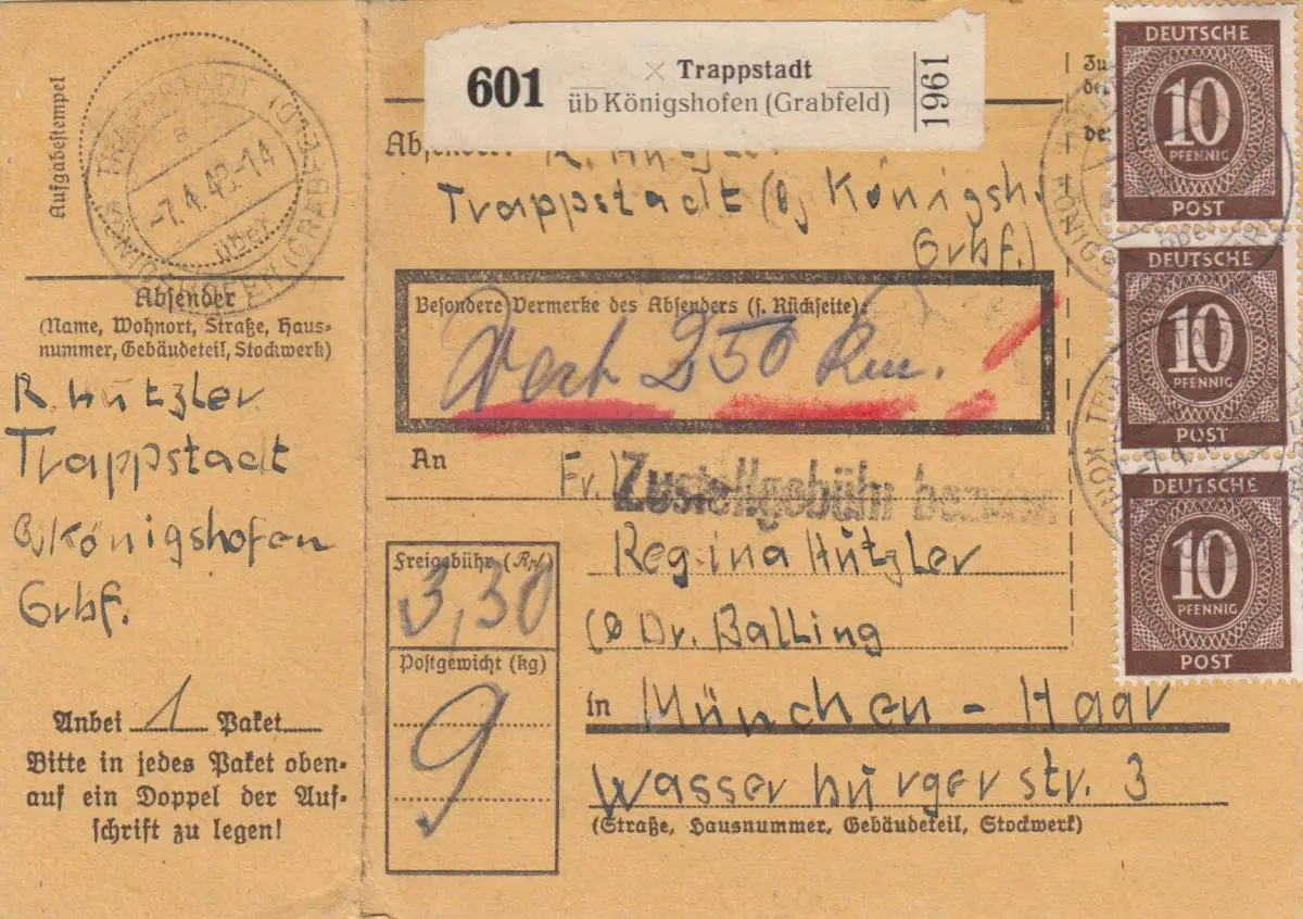 Paketkarte 1948: Trappstadt n. München, Wertkarte, mit Notpaketkarte