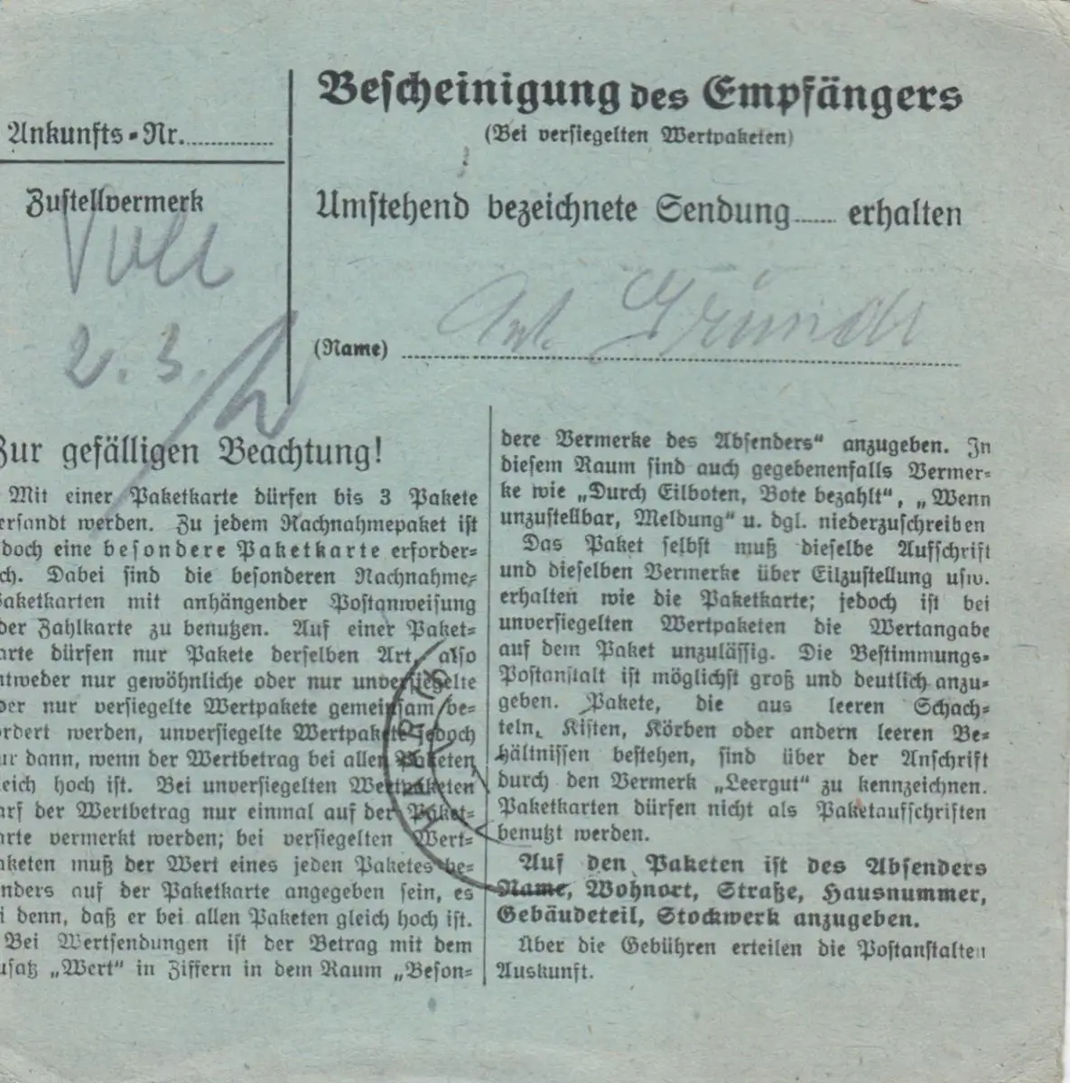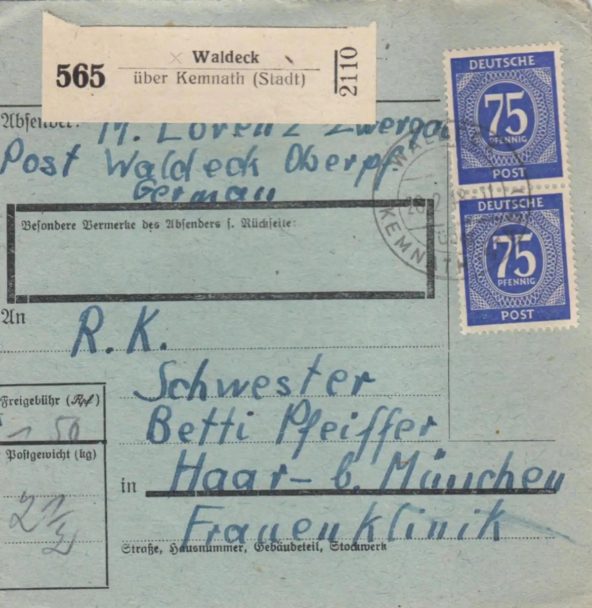 Paketkarte 1948: Waldeck über Kemnath nach Haar, besonderes Formular