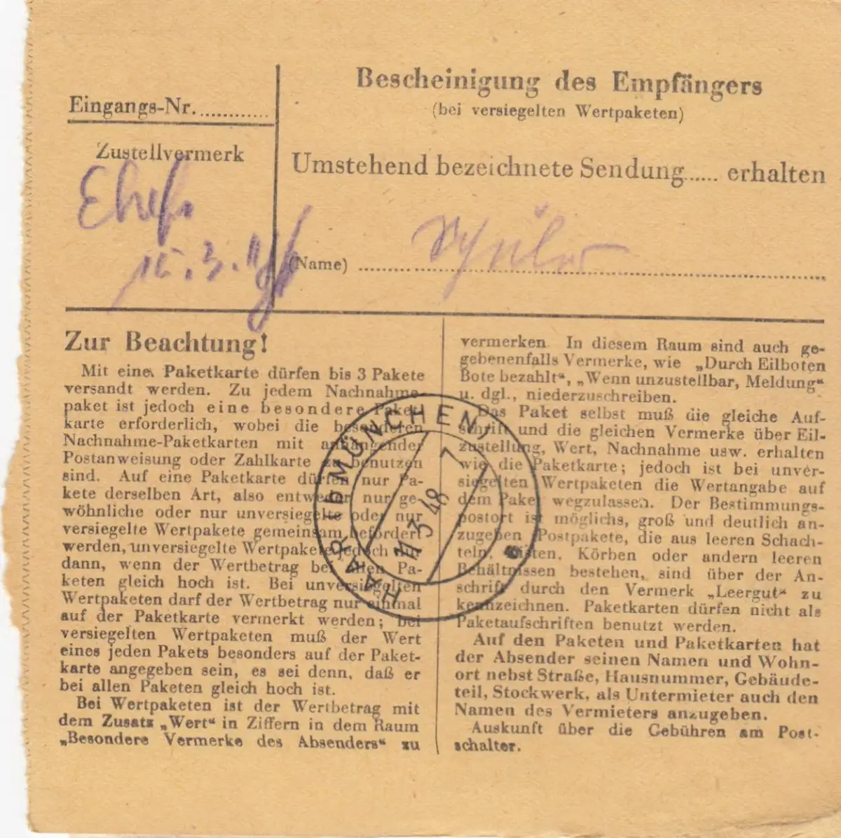Paketkarte 1948: Winterhausen nach Oberpfarramt Putzbrunn