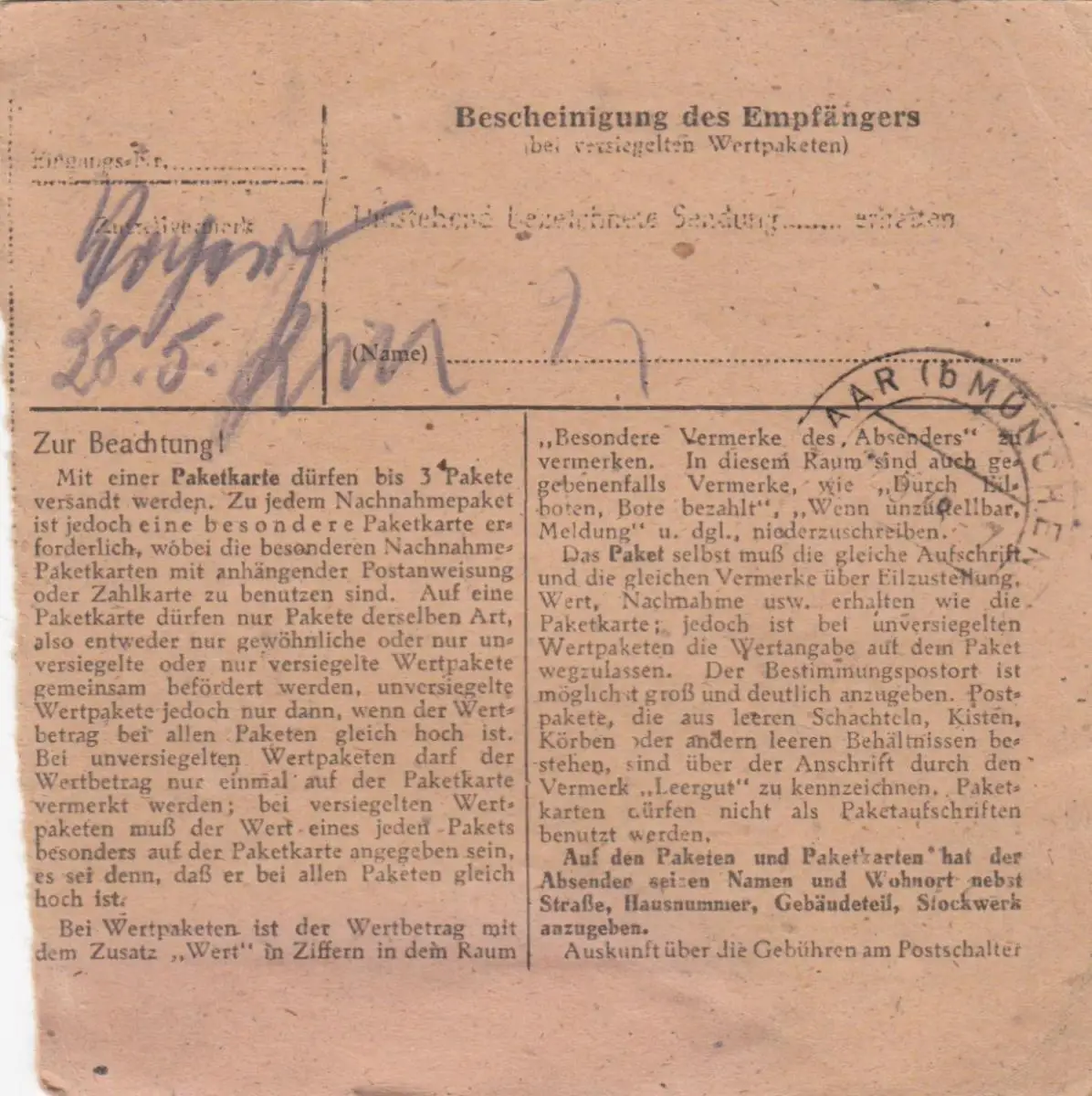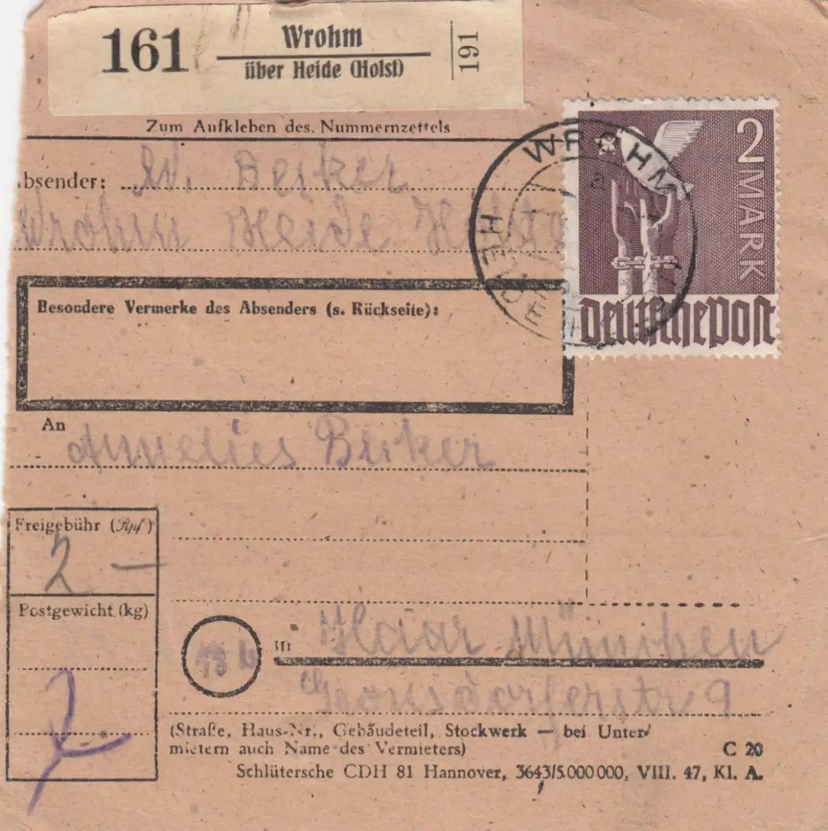 Paketkarte 1948: Wrohm Heide nach Haar