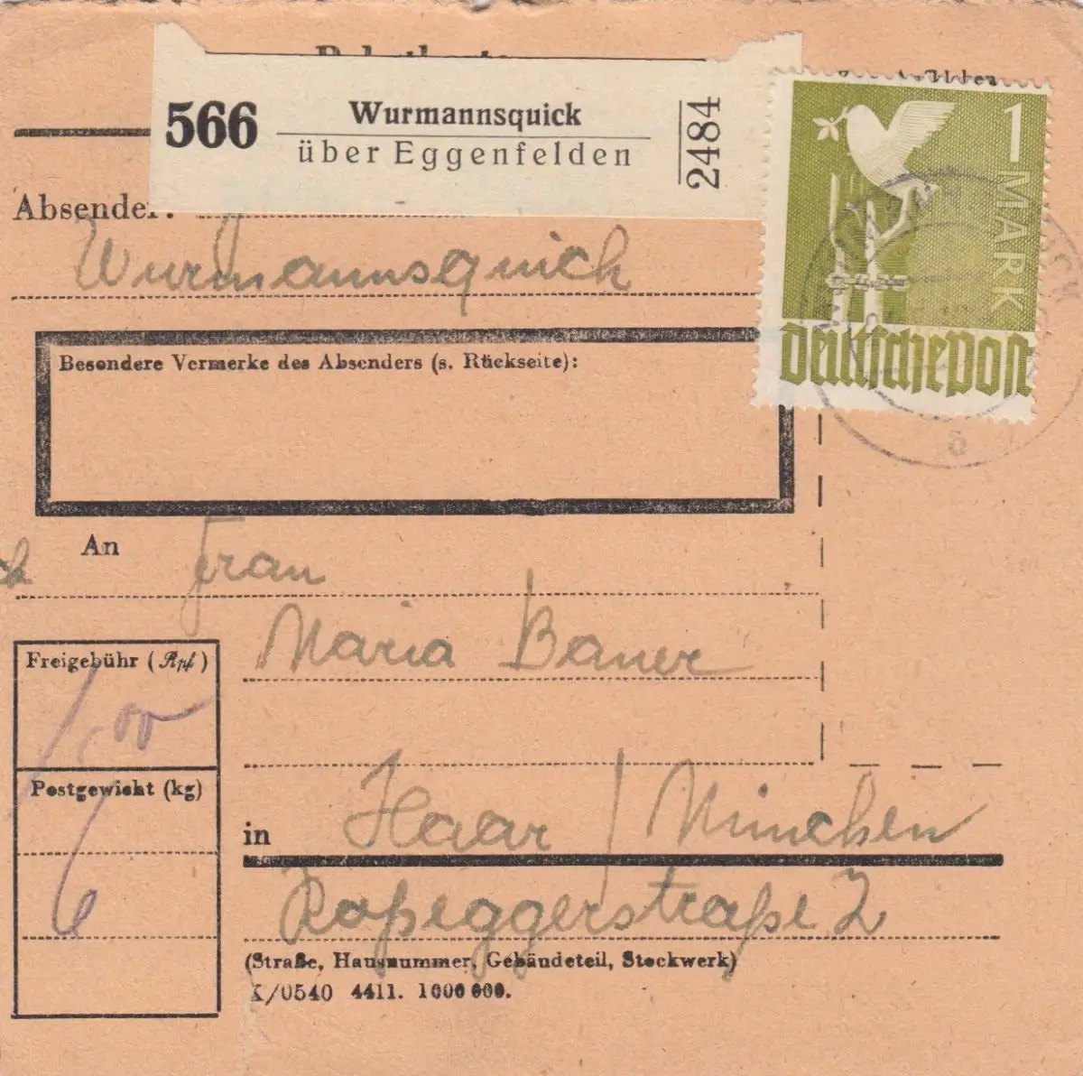 Paketkarte 1948: Wurmannsquick nach Haar bei München