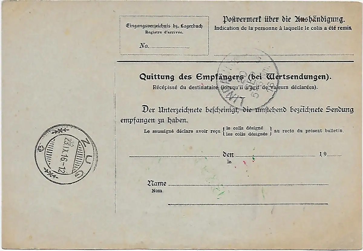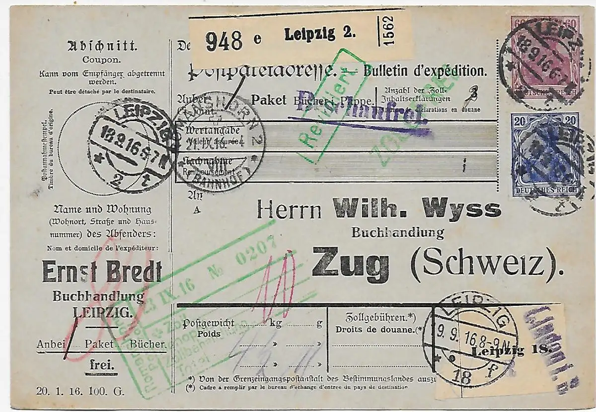 Paketkarte Buchhandlung Leipzig 1916 nach Zug über Lindau, zollfrei - Revidiert