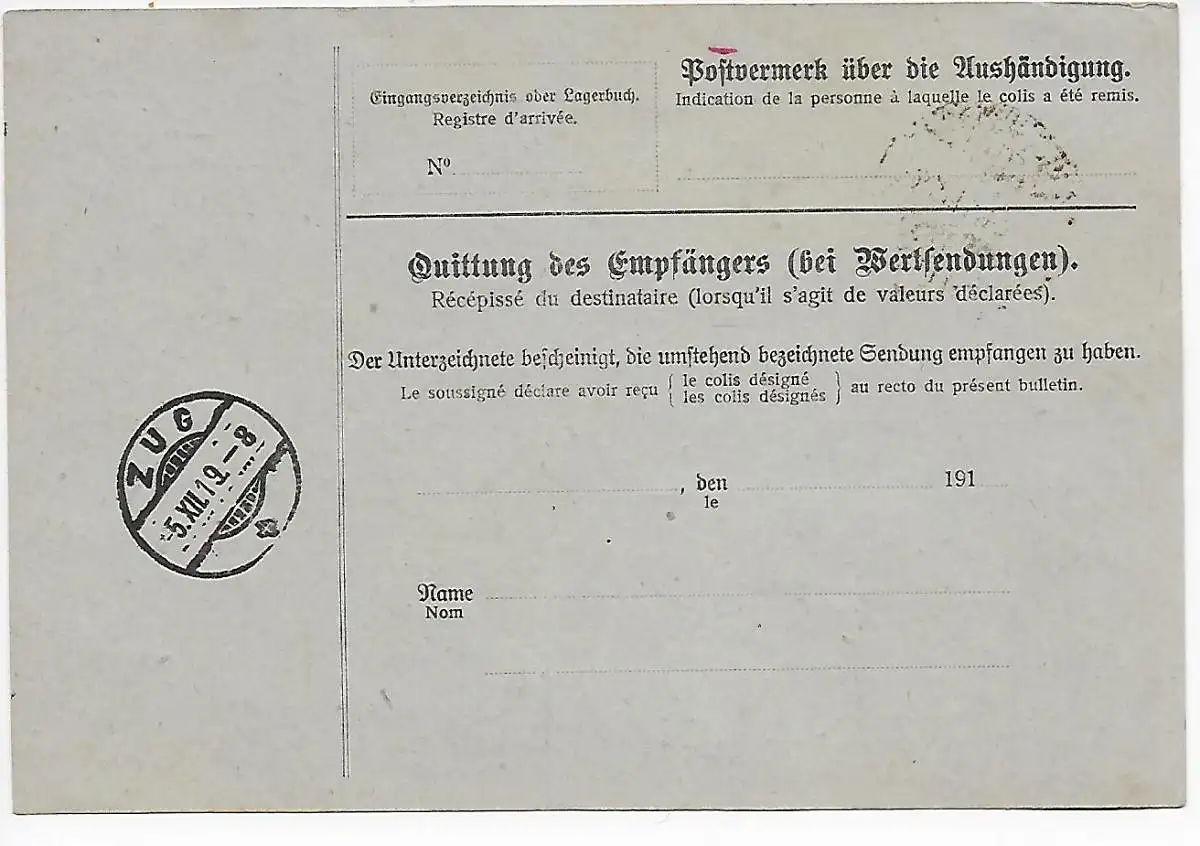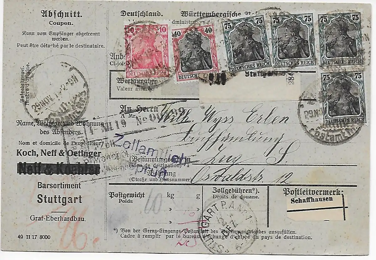 Paketkarte Buchhandlung Leipzig nach Zug 1916 zollfrei über Lindau