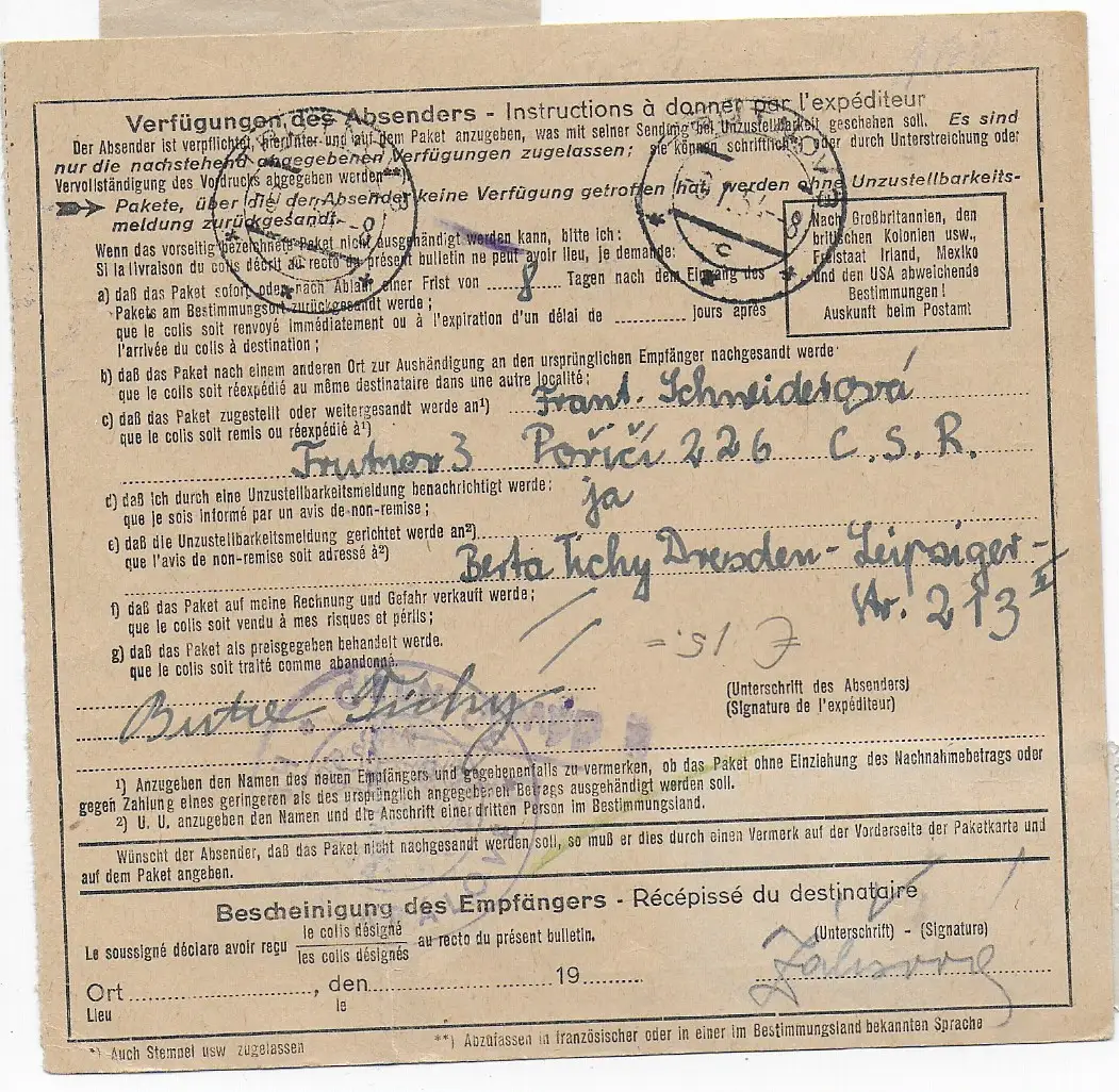 Paketkarte Dresden in die CSSR, 1953