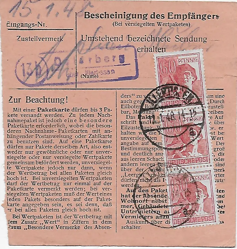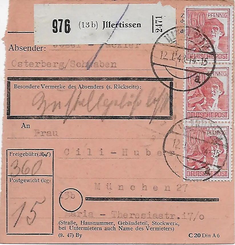 Paketkarte Illertissen nach München, 1948, MeF, Agenturstempel