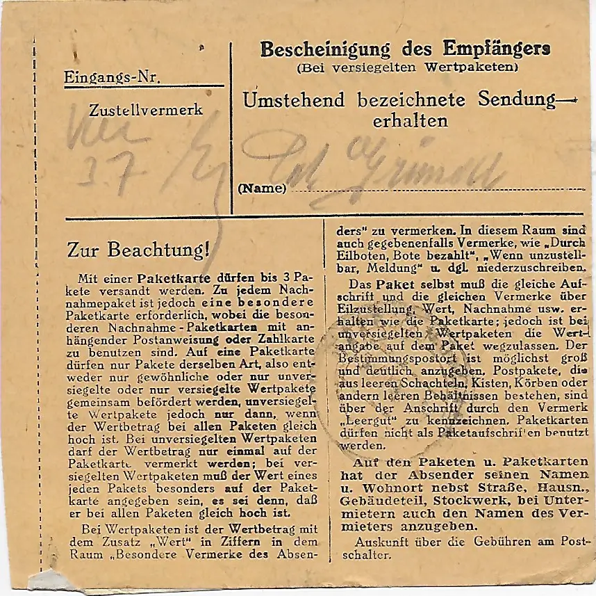 Paketkarte Ingolstadt nach Eglfing 1948, EF