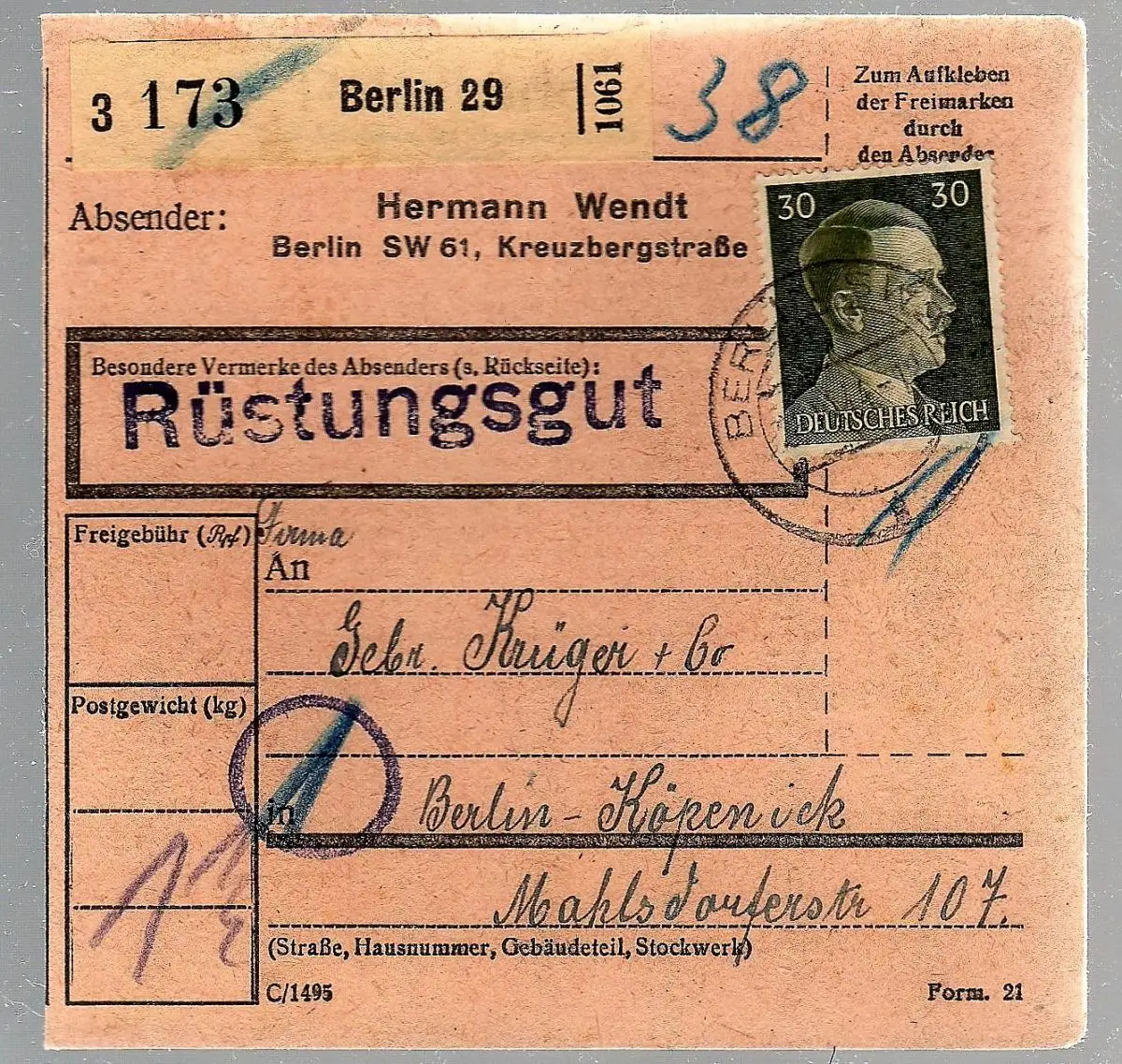 Paketkarte "Rüstungsgut" mit EF 30 Pfg. Hitler