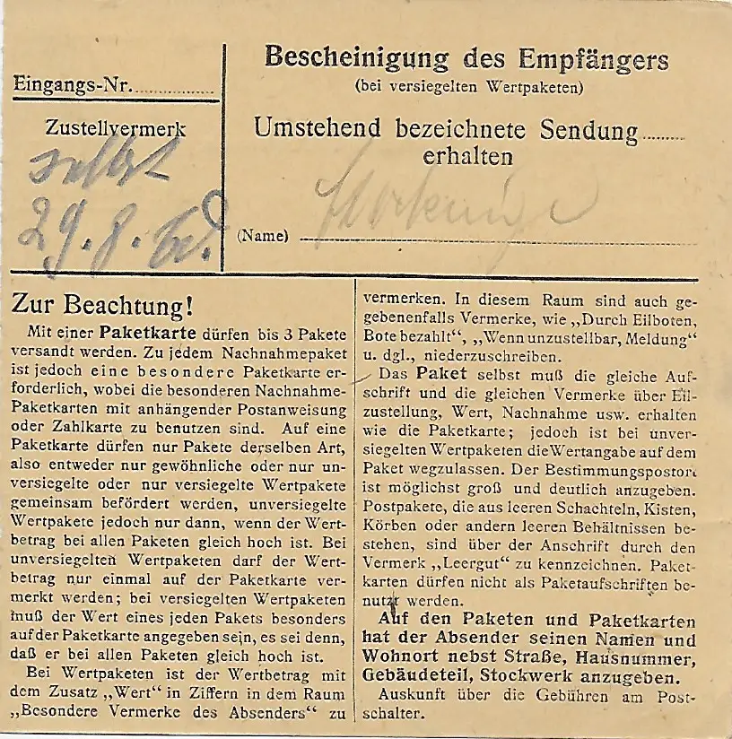Paketkarte von Wasserburg/Inn nach Harthausen, 1947, MeF