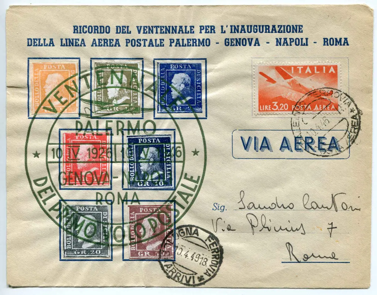 Palermo/Rom - Der Erinnerungsumschlag an die zwanzigjährige Eröffnung der Fluglinie BUSTA - Palermo/Rom - Der Erinnerungsumschlag an die zwanzigjährige Einweihung der Postfluggesellschaft frankiert mit Lire 3,20 Democratica Ann. Palermo 10.4.46. Schöne und ungewöhnliche Nr. 227/6