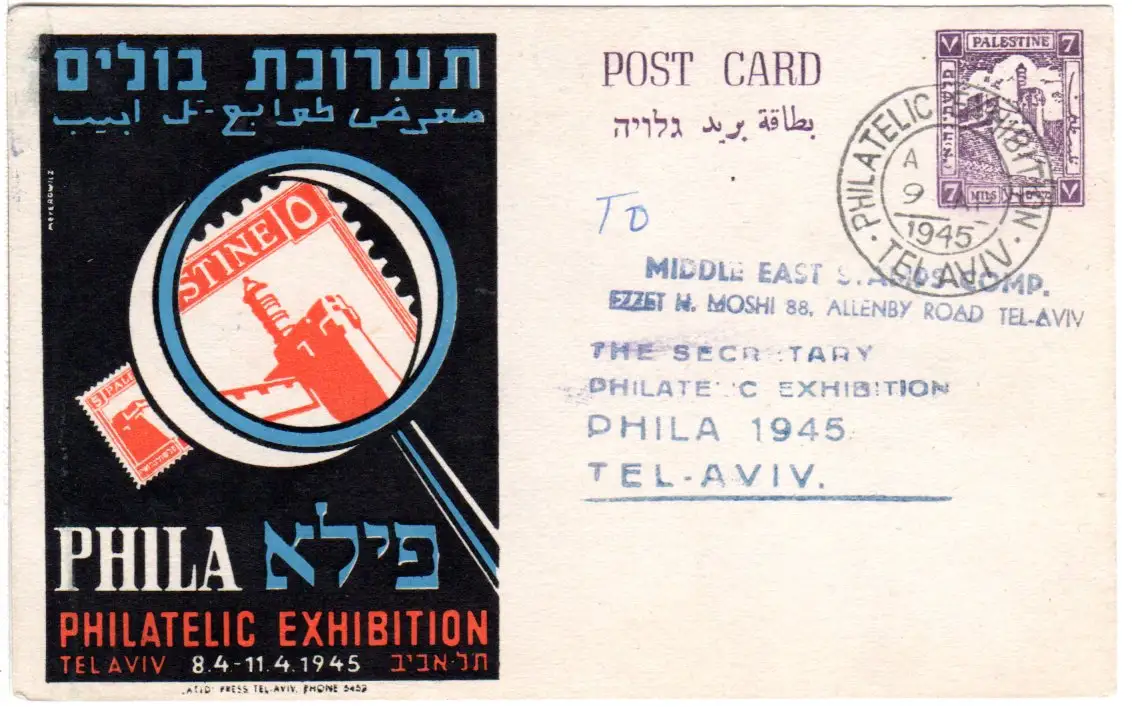 Palestina 1945, gebr. 7 M. Ganzsache zur Philatelic Exhibition Tel Aviv