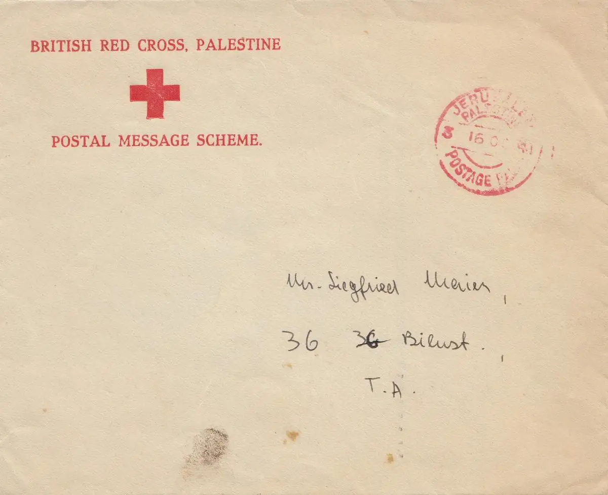 Palestine: 1941: British red cross Jerusalem to Tel Aviv, postage paid