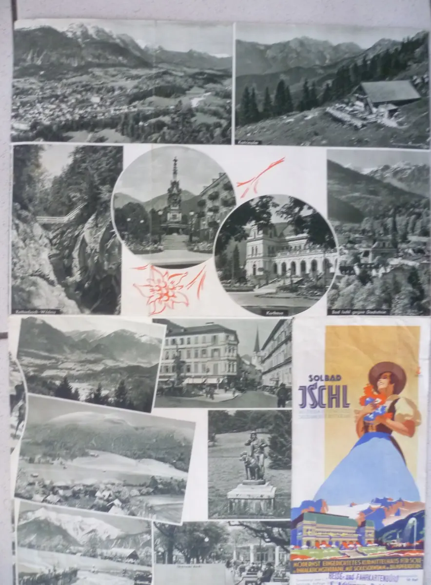 Seltenes Zeitdokument, kurz nach der Besetzung 1939 erschienen. Genehmigt vom L.F.V. Oberdonau Salzburg 7.II.1939. Gezeichnet von J. Heiss - Dionysen -1935. Größe 42x60cm. Rückseitig Fotos von Bad Ischl und Umgebung. Mehrfach gefaltet, minimale Risse an den Faltstellen außen, gut erhalten.