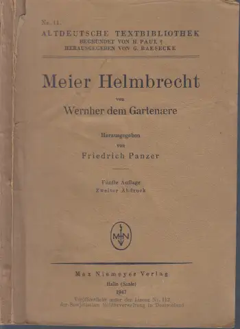 das Buch ist ein Dachbodenfund, gebräunt, fleckig, Namenseintrag, die Einbandkanten mit stärkeren Bestoßungen, mehrere Seiten sind lose, Das nachstehende Gedicht, das wir nach derüberSchrift in A nicht ganz passend „Meier Helmbrecht" zu nennen gewohnt sind, ist uns nur in zwei jungen Handschriften erhalten: A das berühmte Ambraser Heldenbuch, jetzt (als Eigentum des Kunsthistorischen Museums) in der Nationalbibliothek in Wien, Pergament, 1504-15 von lans Ried, Zollschreiber am Eisack zu Bozen für Caiser Max geschrieben, überliefert S. 225b-229b unser Gedicht. B die Berliner Hs., Mss. Germ. fol. 470 der Öffenflichen Wissenschaftlichen Bibliothek, Papier, im 15. Jh. in Österreich geschriebe, enthält Bl. 1-229b den jüngeren Titurel, Bl. 229b bis Schluß von derselben Hand unser Gedicht. ... (aus dem Büchlein) Beschreibung vom Antiquariat Ardelt 1e4a Antiquariat Ardelt