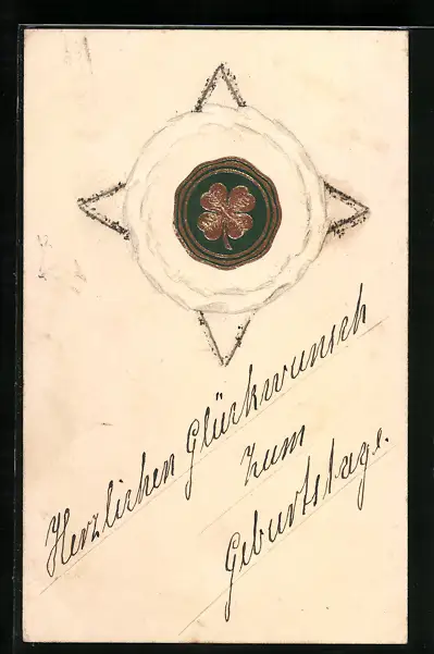 Papierkunst-AK geklebte Blume mit gezeichnetem Stern, Kleeblatt