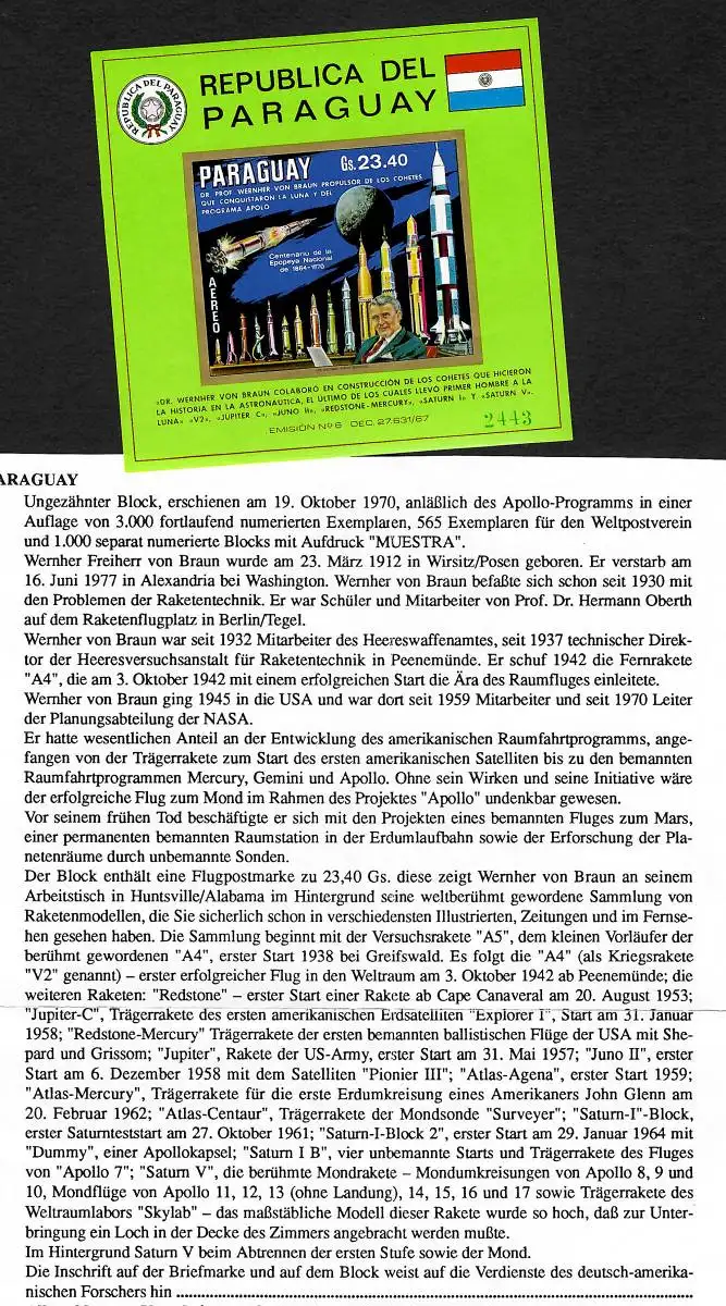 Paraguay: 50 Jahre Mondlandung, Wernher von Braun, Mondprogramm, postfrisch