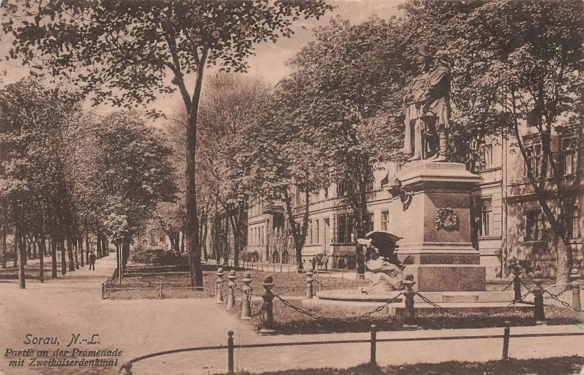 Partie an der Promenade Zweikaiserdenkmal Sorau Ostbrandenburg Postkarte AK 1916