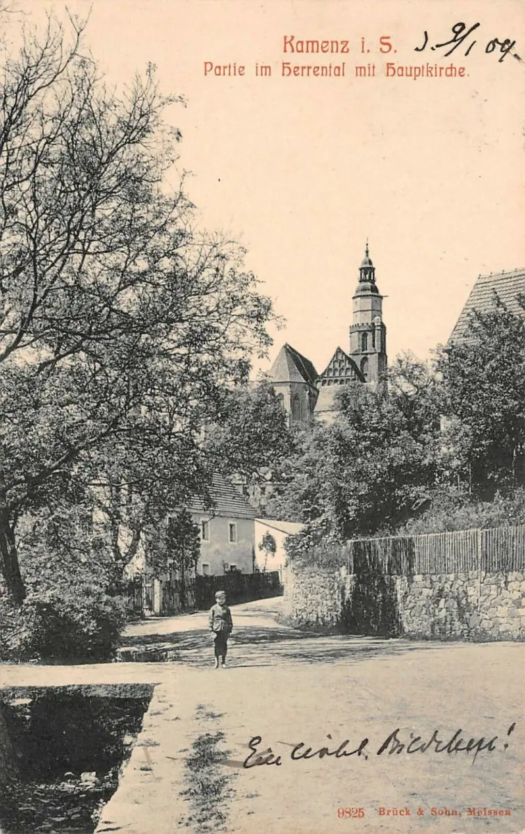 Partie im Herrental mit Hauptkirche in Kamenz Sachsen Postkarte AK 1909