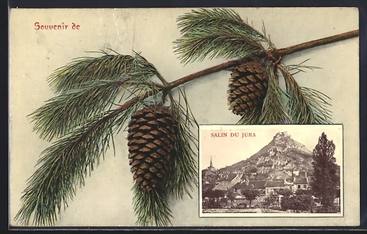 Passepartout-AK Dresden, Gesamtansicht auf Frauenkirche, Tannenzweig mit Tannenzapfen