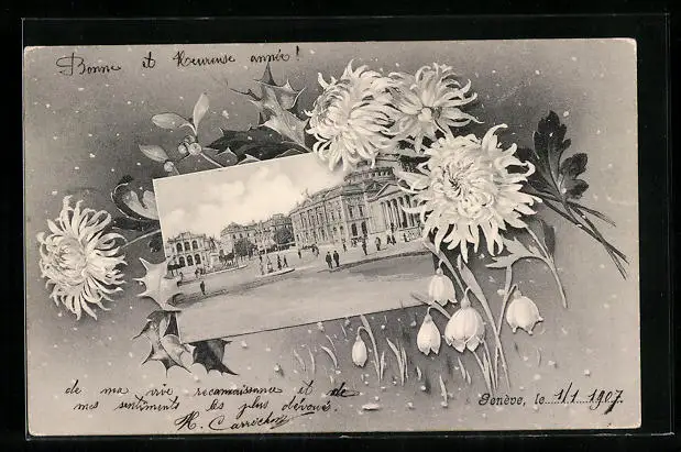 Passepartout-AK Genève, Stadtplatz, Blumen