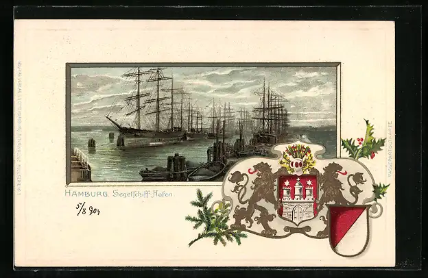 Passepartout-AK Hamburg, Hafenansicht mit Segelschiffen, Stadtwappen
