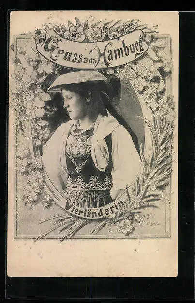 Passepartout-AK Hamburg, Vierländerin in Tracht, Blumen