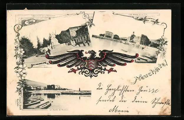 Passepartout-AK Neuchatel, Monument de la Republique, Les Postes et le Portz, Präge-Wappenvogel