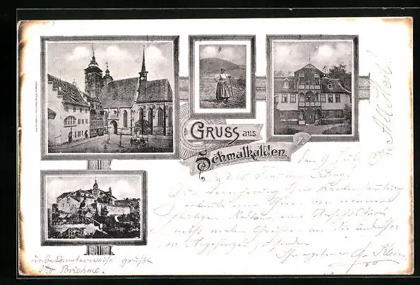 Passepartout-AK Schmalkalden, Kirche, Ortsansicht, Frau im Dirndl