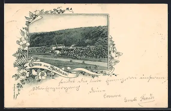 Passepartout-AK Schönau / fränk. Saaletal, Ortsansicht aus der Vogelschau