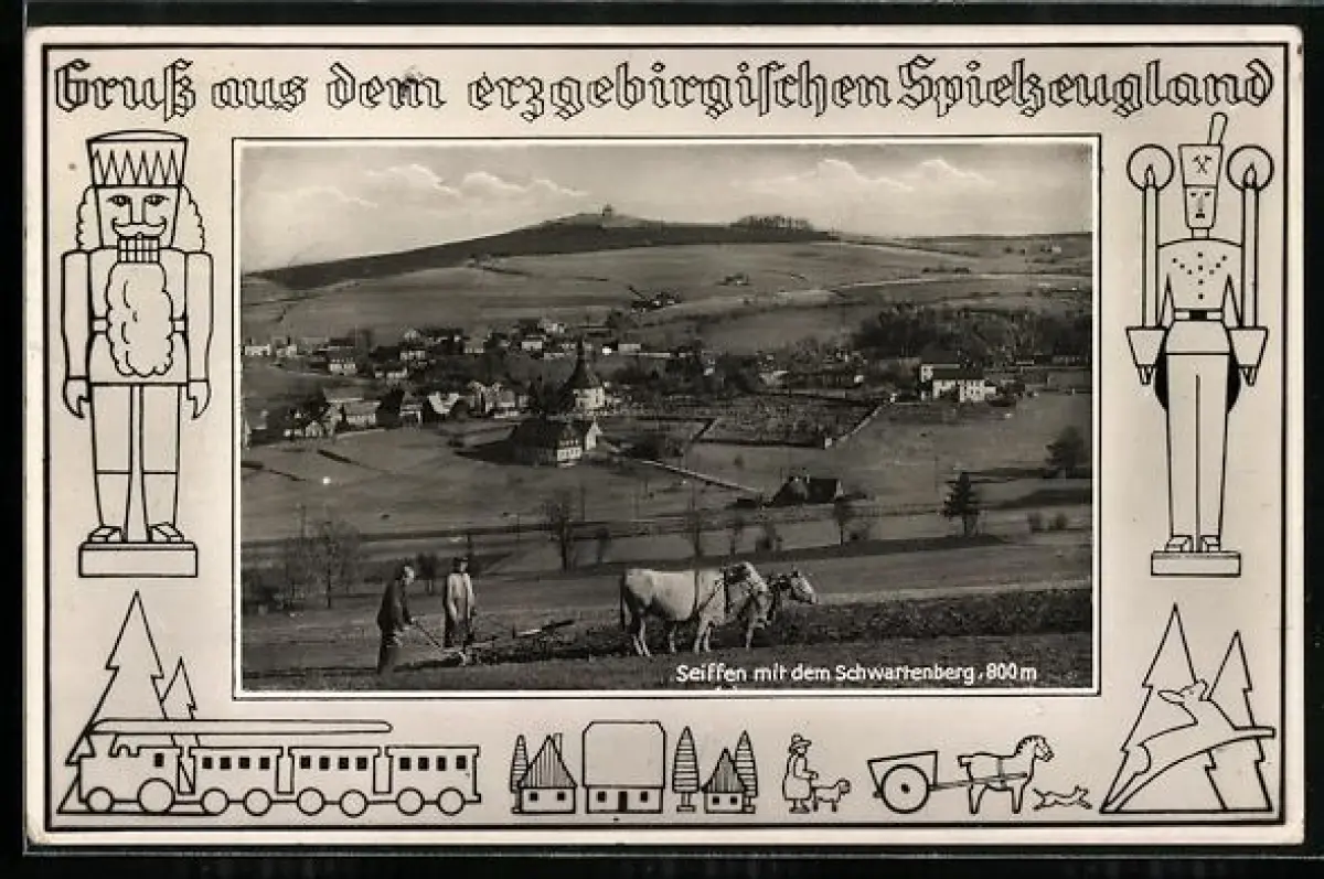 Passepartout-AK Seiffen, Ortsansicht mit Schwartenberg, Bauern mit Pflug, Spielzeuge, Nussknacker
