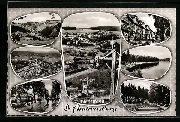 Passepartout-AK St. Andreasberg, Strassenpartien, Ortsansicht mit Seilbahn