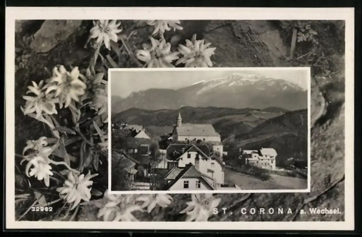 Passepartout-AK St. Corona a. Wechsel, Ortspartie mit Bergen
