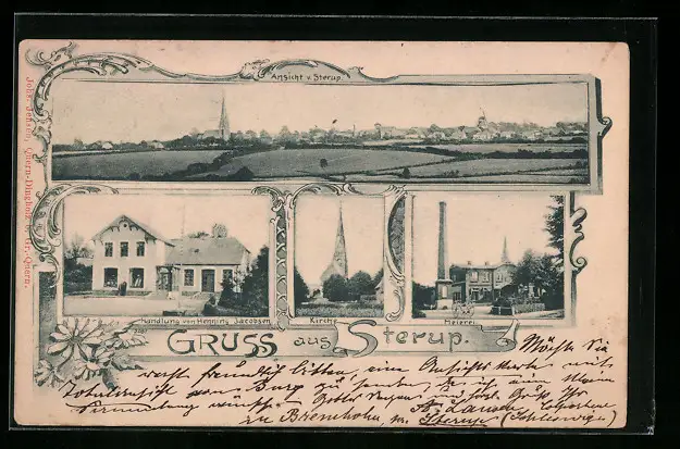 Passepartout-AK Sterup, Handlung H. Jacobsen, Meierei, Ortspanorama aus der Ferne