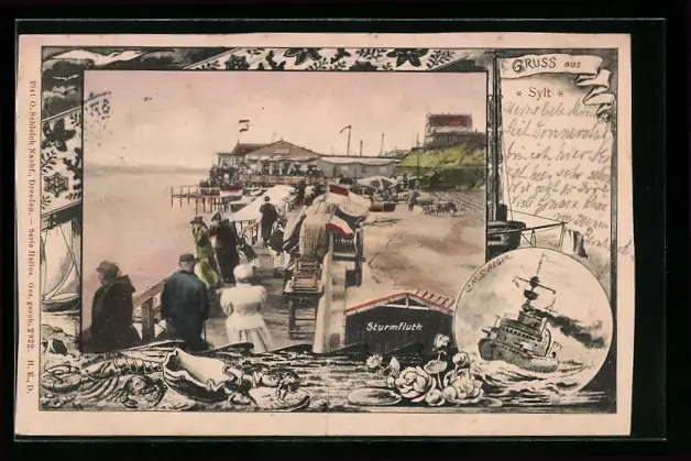 Passepartout-AK Sylt, Gasthaus und Uferpromenade mit Besuchern, Sturmfluth, SMS Aegir
