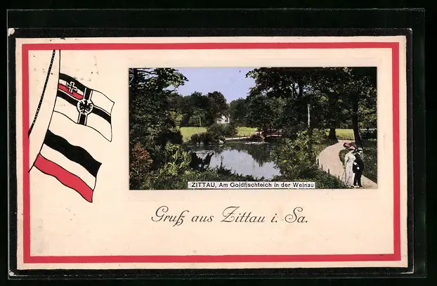 Passepartout-AK Zittau /Sa., Am Goldfischteich in der Weinau, Flaggen