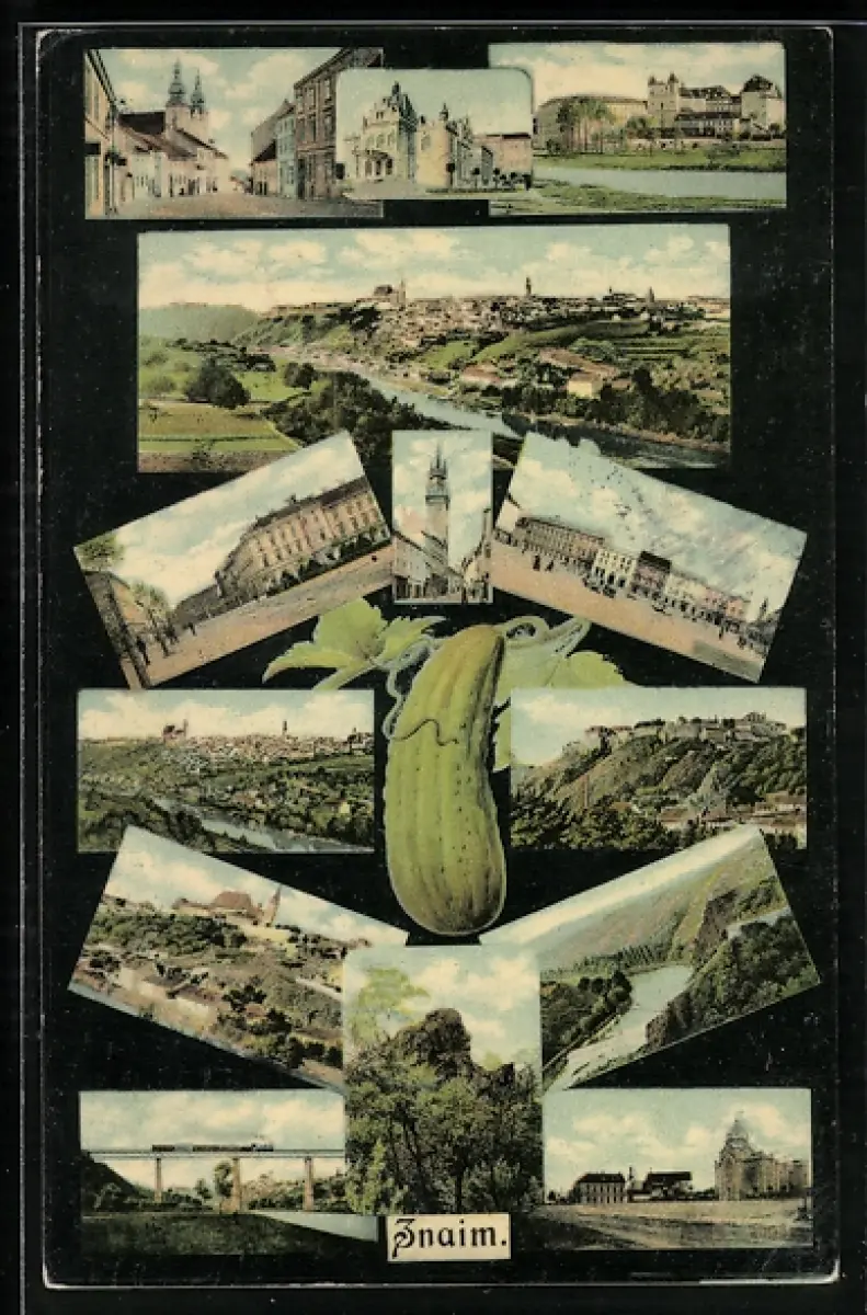 Passepartout-AK Znaim, Stadtansichten und Gurke