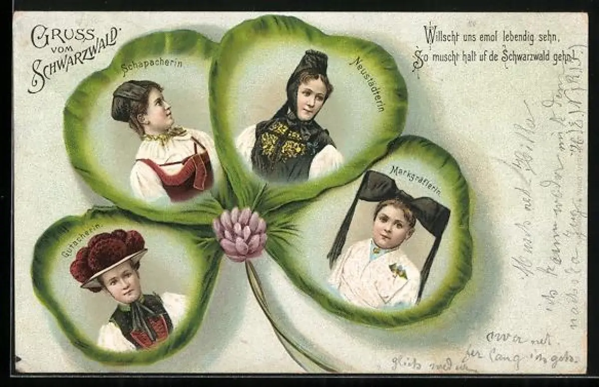 Passepartout-Lithographie 4 Frauen in Schwarzwälder Tracht im Kleeblatt abgebildet