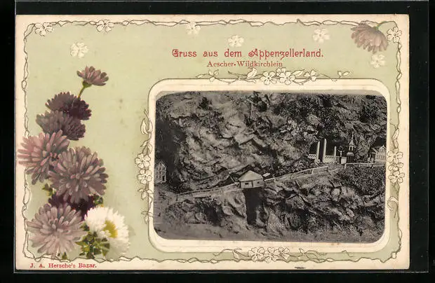 Passepartout-Lithographie Aescher, Wildkirchlein aus der Vogelschau, Blumen