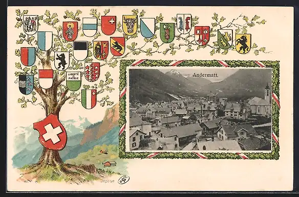 Passepartout-Lithographie Andermatt, Blick über die Dächer, Eiche mit Wappen der Kantone