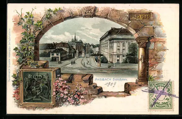 Passepartout-Lithographie Ansbach, Partie am Schlossplatz, 1865, Wappen